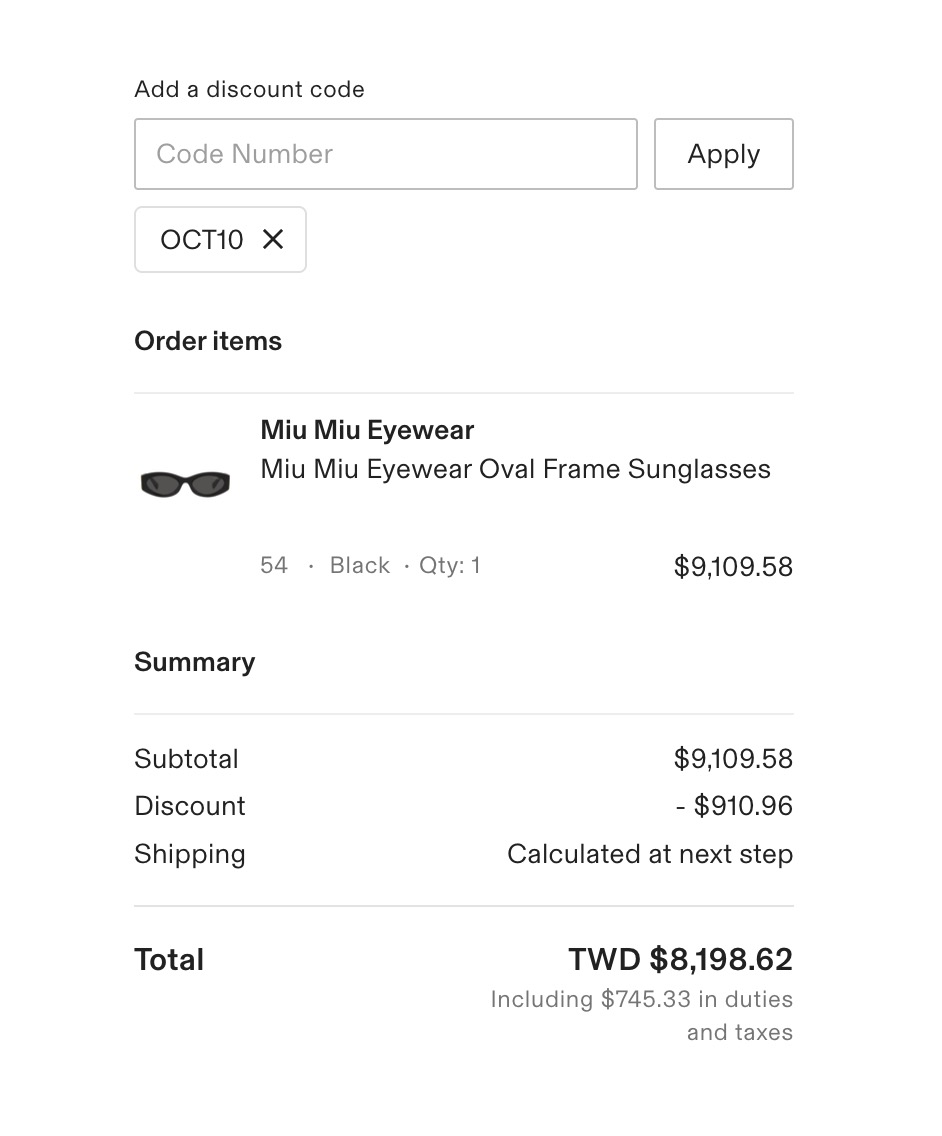 不但補貨還降價了快收!趙露思同款 Miu Miu 爆款 11W小貓眼太陽眼鏡,特價 9,109.58+9折=8,199 含稅而且剛好滿免運!台灣一萬六等於 51 折啊!之前還要58-61折喔!額外9折碼【OCT10】。