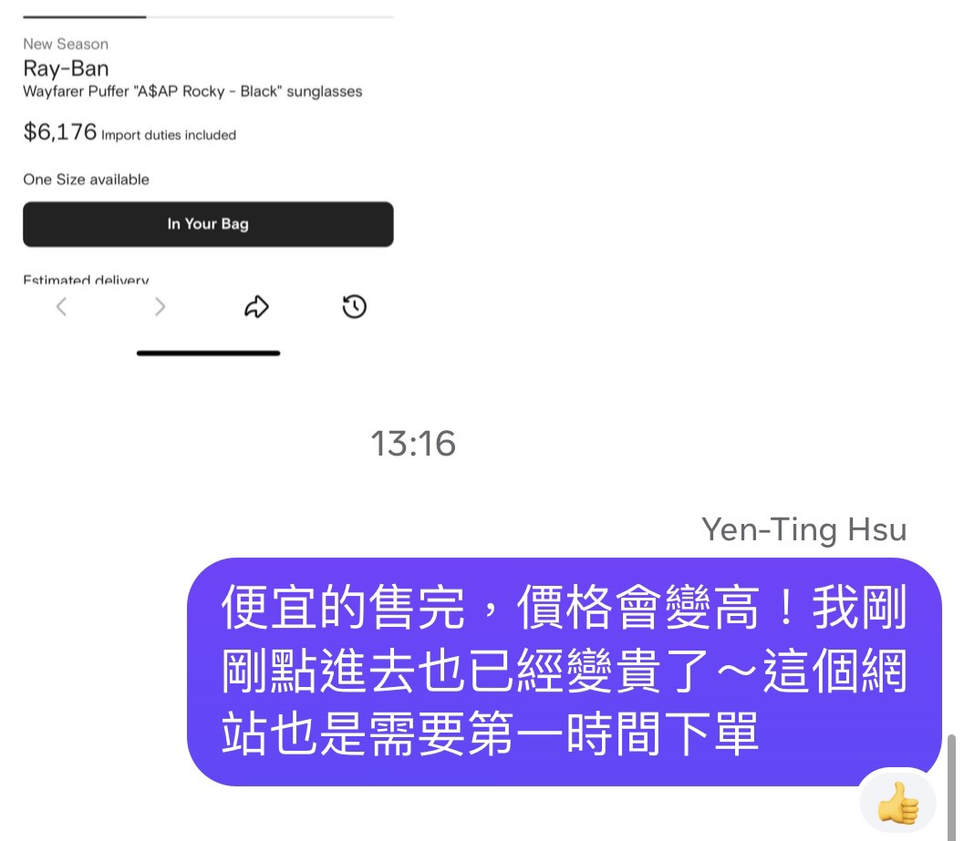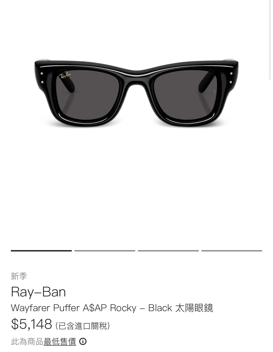 Jennie 前陣子出席雷朋活動戴的墨鏡:Rayban Wayfarer Puffer,是和饒舌歌手A$AP Rocky的聯名款,美國站定價要 202 美金(約合台幣 $6178),台灣官方售價據說是 NT$7,650,Farfetch 現在只要 NT$5,148,低價賣完會漲價,有喜歡的人要快喔!