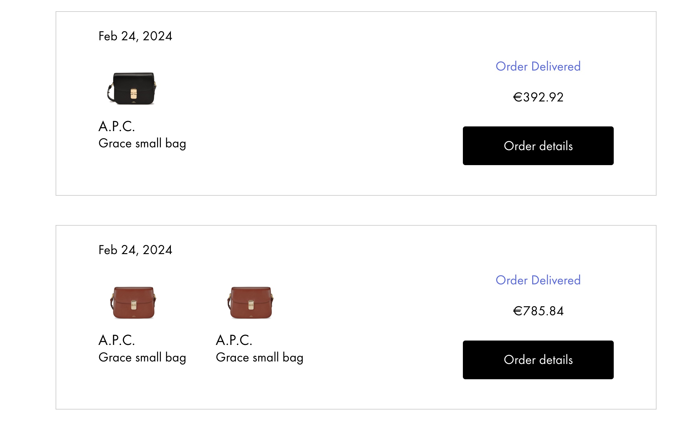 購買金額:A.P.C. Grace Samll 我當時是在 24S 買的,含關稅、免運不到台幣 1.4 萬!