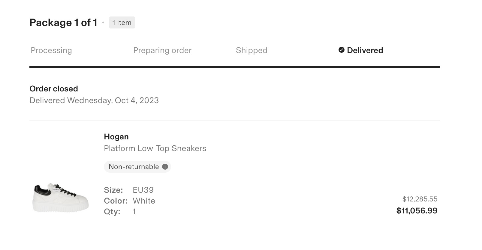 購買金額:昆凌同款 Hogan 餅乾鞋是被群友燒到的,當時特價 12,285.55,再打額外九折=台幣 11056.99,專櫃價 21,800,約 51 折!